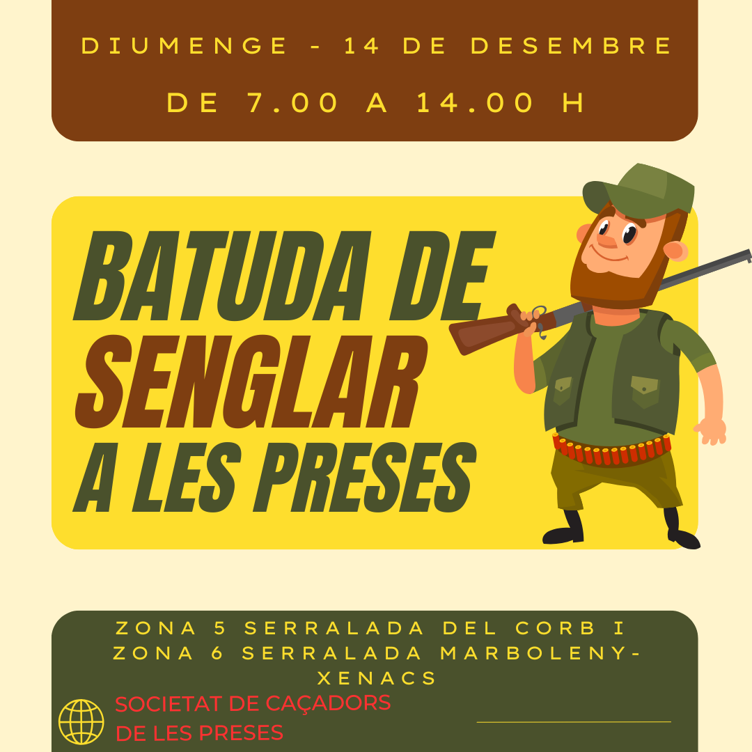 La Societat de Caçadors de les Preses ha comunicat que aquest diumenge 14 de desembre es durà a terme una batuda de senglars a la zona de les Preses, concretament a la serralada del Corb i a la serralada de Marboleny i Xenacs, entre les 7.00 h i les 14.00 h. Es recomana extremar les precaucions i evitar aquestes zones durant l’horari indicat per garantir la seguretat de tothom. Agraïm […]